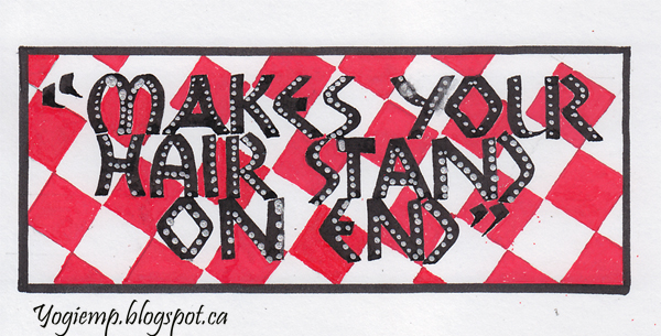 Date: Sept 22, 2021 "Makes Your Hair Stand On End" Staples 110# white cardstock with a 3.0 Parallel pen and Sumi ink. Detailed with a Molotow Liquid Chrome 2mm pen. Painted the checkered background with Artistro Brush pen. |