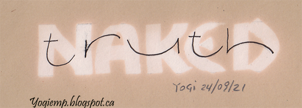 Date: Sept 24, 2021 "Naked Truth Staples 110# white cardstock with a 2.4 Parallel pen and Sumi ink. Painted the background with Artistro gold brush pen. On Beige: Stillman & Birn NovaTrio paper. wrote out the words with a 6.0 Parallel pen and (fresh jug) Clorox. Wrote "truth" on top with a Micron pen in Akim style.