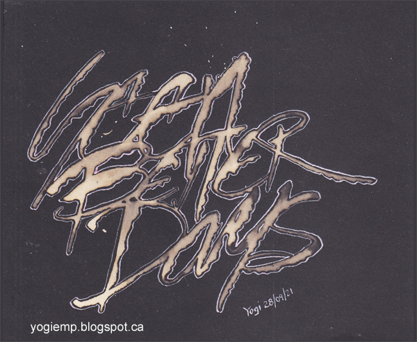 Date: Sept 28, 2021 "Seen Better Days" Again the color is all wrong... It's pure black paper, and the bleach is a beautiful golden brown. On Stillman & Birn Nova Tria black paper using Clorox and a Brody pen wrote out the words. When dry outlined - a la Thomas Hoyer - with a silver gel pen. |