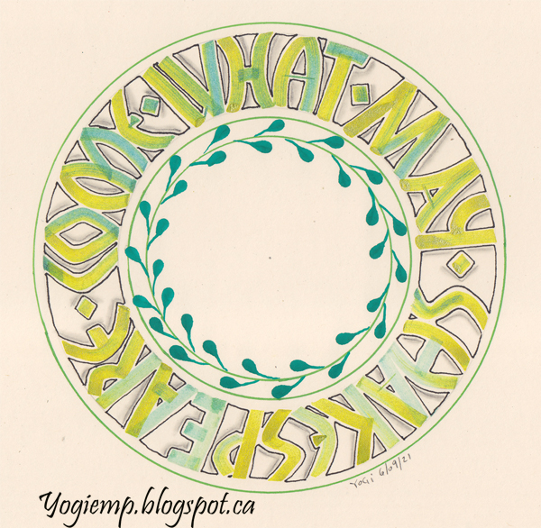 "Come What May" On Staples 110# cream toned cardstock and using a Helix Circle ruler drew my circles for the lettering at 2" and 3" and my decorative circles at 1-6/10 & 1-8/10ths and the outside circle at 3-1/10th using an Artistro "green" Extra Fine paint pen. Filled an empty cartridge with Pearlescent Galactic Blue Liquid Acrylic. Inserted it into a 4.5 Parallel pen and double dipped it into Genesis Green doing a Neuland style lettering. Outlined with a Micron pen and shadowed with a Caran D'Ache 5B pencil and blended with a paper stump. Created the leaves with an Artistro green Fine tipped rush pen. |