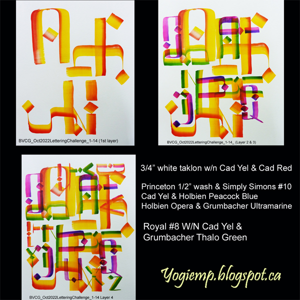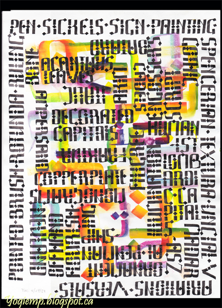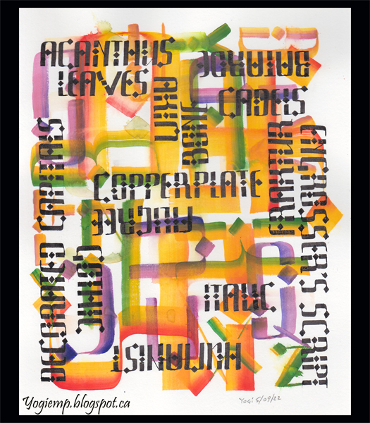 Day 1 - 14 On Master Choice 140#watercolor paper I wrote out the alphabet using various sized chisel brushes 3/4", 1/2", #12 and #8 double loading them with various watercolor and shifting my paper and letter orientation constantly.. When dry, wrote a bunch of letters with just a wet paintbrush over the previous layer, which dragged some colors. Then misted lightly to bleed a bit... After the artwork was dry, wrote in all the words, again turning the page and letter orientation, using a 3.0 Parallel pen and Sumi ink in Wouters'style lettering. |