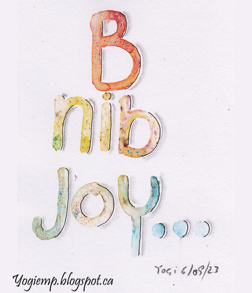 2023 More playing with the gals. One of my pen holders had a large B nib so thought I'd play with it in my Bister powders... Sprinkled Bister powders on Fabriano 1264 Mixed Media paper and using the B nib created the words. When dry shadowed with both a Juice Up pen and a graphite pencil and paper stump