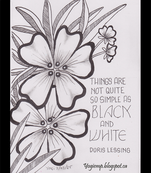 Black & White Floral - Black White Created: March 3, 2025 size: 4.5"w x 6"h Maybe it's the snowy day today but I wasn't in a mood for color... hence the black & white. Done on Canson Pen & Ink paper, ZIG Writer, Juice Up pen, HB Caran d'Ache Grafwood pencil and paper stump. Monoline and a touch of Art Nouveau lettering. words: