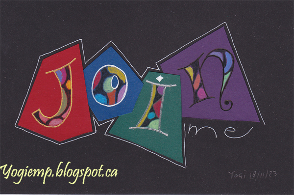 2023 I recently purchased the 100 set Faber-Castell Black Edition colored pencils specifically created for black paper from Kensington Art Supply here in Calgary. So I wanted to try them on other colors and I love the results... On Michaels Recollection Jewel cardstock. "A" on the red outlined with a Signo gold gel pen. "O" on the blue a Sakura Geli roll white pen. "i" on the green a Signo silver gel pen "n" on the purple a black Signo gel pen which barely showed up when dry so went over it with US ArtQuest Mica Color "Sepia Veil". Cut the letters in funky shapes and adhered to black Paper Reflections cardstock. Outlined with a Juice It white pen, and wrote in the word "me"