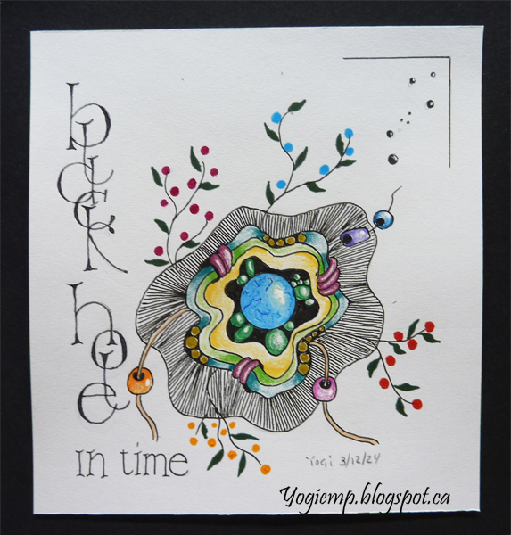 size: 5" sq This piece just evolved without any thought... and when I saw the black hole in the center with the balls floating within it, it reminded me of the Black Hole in space. On Edge Mixed Media paper using a Juice Up pens, Zig Writers, Posca colored pencils. Wrote the quote in basic serif style. words: black hole in time |