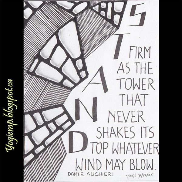 size: 6"h x 4.5"w On Canson Mixed Media paper created the design with a ZIG Writer and shadowed with Caran d'Ache Grafwood B pencil and paper stump/ Lettering done with a black Staedtler Calligraphy Duo pen and a ZIG Writer words: Stand firm as the tower that never shakes its top whatever wind my blow. Dante Alighieri
