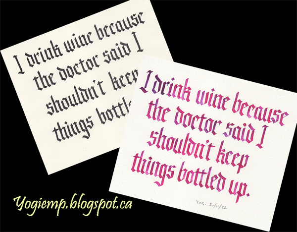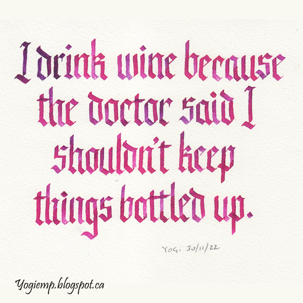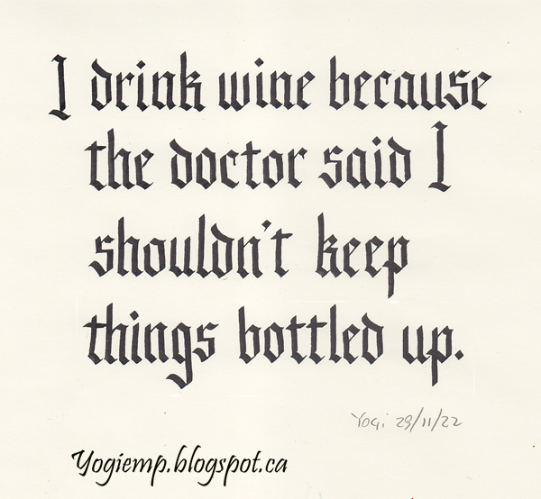 After taking Tamer Ghoneim's Blackletter class held by LAGRD I thought I'd practice a bit today... Blackletter Foundry. Words: I drink wine because the doctor said I shouldn't keep things bottled up.
