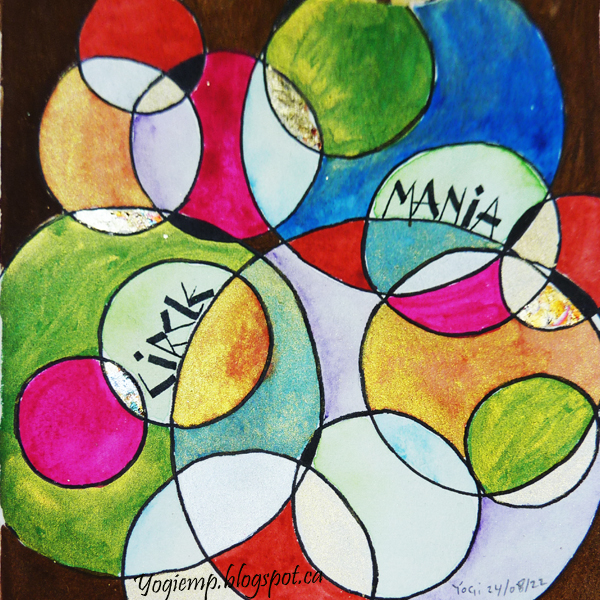 ID: Abstract WC - Booklet - Circle Mania Zig Writer drew my circle design using a Rapid Design #40 circle template. Painted with various watercolors including Kuretake Gansai Tambi "Starry" Color set. Added variegated gilding leaf. Can't say it's my best gilding... it's been ages since I've done any. I used MonaLisa gilding adhesive. Lettering in a Funky Neuland style with a 3.0 Parallel pen and Sumi ink.