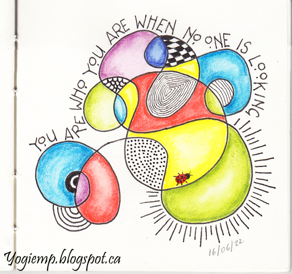 ID: Abstract WC - Booklet - You Are Who Micron .08 pen drew the abstract linear design. Colored with Derwent Inktense watercolors. Added doodling and a ladybug. Lettering in a monoline with the micron pen.
