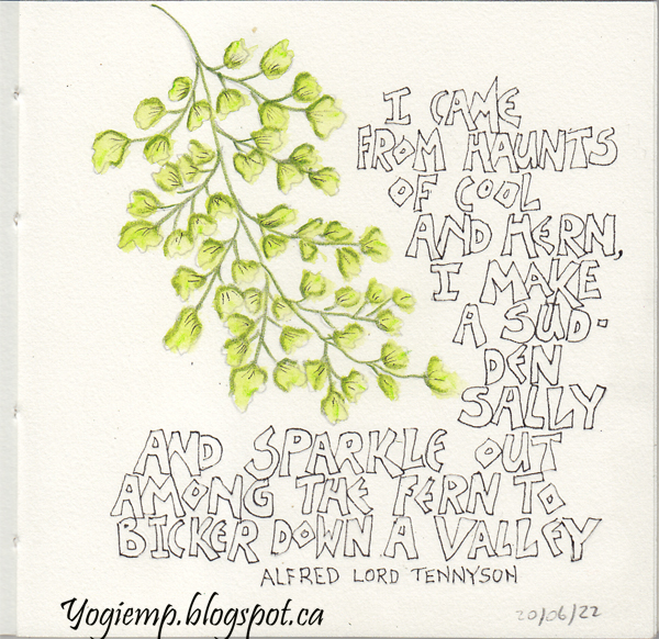 Painted the fern with Derwent Inktense watercolor pencils and water. Quote written with a .02 Micron in a funky style. Quote: I came from haunts of cool and hern, I make a sudden sally and sparkle out among the fern to bicker down the valley. Alfred Lord Tennyson |