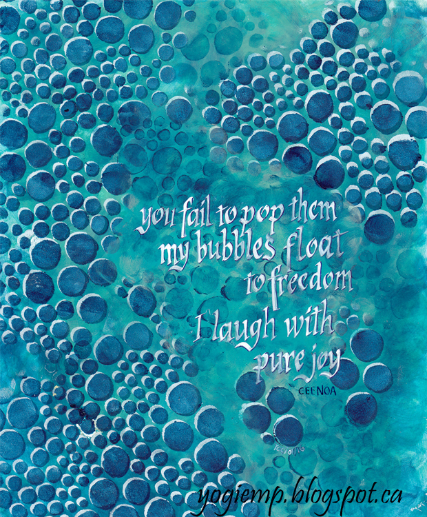 I created the background on glossy cardstock with acrylics and a stencil shift technique. Sponged on Folk Art "Lime Yellow", then started blending with a sponge Ceramcoat Delta "Laguana", then some "Prussian Blue", till got what I liked... Placed a stencil (Dylusions "Holes Small") and sponged Ceramcoat Delta "Blue Mist", moving the stencil and repeating till I had bubbles all over. Shifted the stencil and sponged the Prussian Blue". In the center area, I just sponged the Blue watered down to give a ghost type image. Wrote my quote using Copic White Opaque ink mixed 50/50 with distilled water. Loaded my 2.4mm Parallel pen with the white and side loaded with Golden Liquid Acrylics "Indigo"), then shadow outlined the letters with a Zig Writer blue marker. |