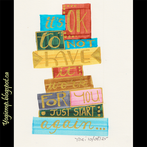 size: 3.5"w x 5.5"h I saw something similar on Instagram a few times... I finally played with the technique. I'll probably do a bunch more. On Strathmore Calligraphy paper created each block one at a time with various brands of Calligraphy markers, adding the words with a Unibal gold gel pen, each block in a different script style. words: it's OK to not have it work for you. Just start again...
