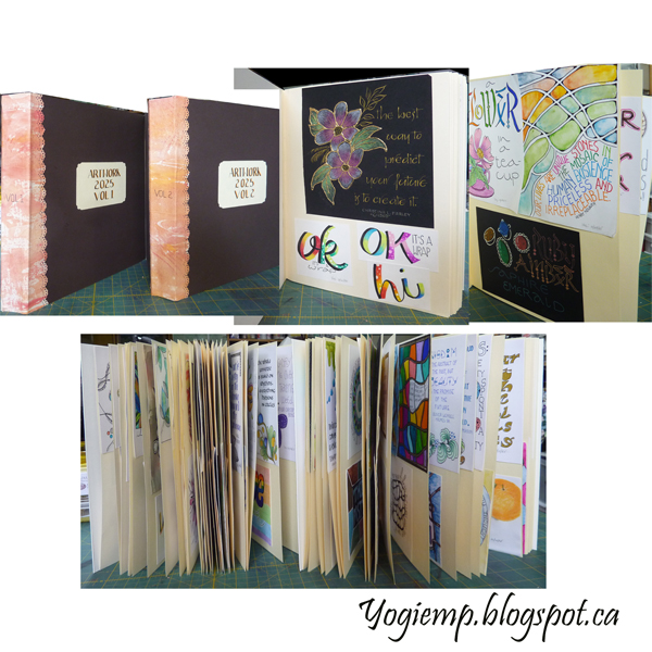 size: 11"h x 8.5"w x 15"thk each Using Value Pack Neutrals cardstock for the pages, adhered to an accordion bound spine made from 1" folds. Approx 22 sheets per book with artwork on both sides of the pages. Covers made with dark brown matboard (front, spine and back). Using bookbinding tape to adhere it together. Added one of my gelli print papers to camouflage the tape and as a decorative element. Wrote the titles on the neutral cardstock trimmed down, punched the corners with a decorative corner punch. Added the vol # to the spines. |