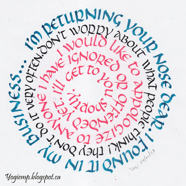 23, 2023 After Rachel Yallop's class this weekend, I've been playing with circles again... This time I wanted to do sarcasm. This piece is I think my 5th version trying to get a smooth transition for the longer saying (the one in red). I'm still not perfectly happy. Don't like the close ending of the black words... I might try it one more time in the future... On Canson Marker Pro Layout paper I drew my circles with an Orbis Circle Scissor. The blue is a 2.4 Parallel pen with Ecoline Turquoise Blue ink. The black is a 1.5 Parallel pen and Sumi ink. The red is a 2.0mm red Zig Writer pen all done in Uncial style.. The blending of lines for the red saying took quite some playing around... But I think it's a smooth as I can get it.