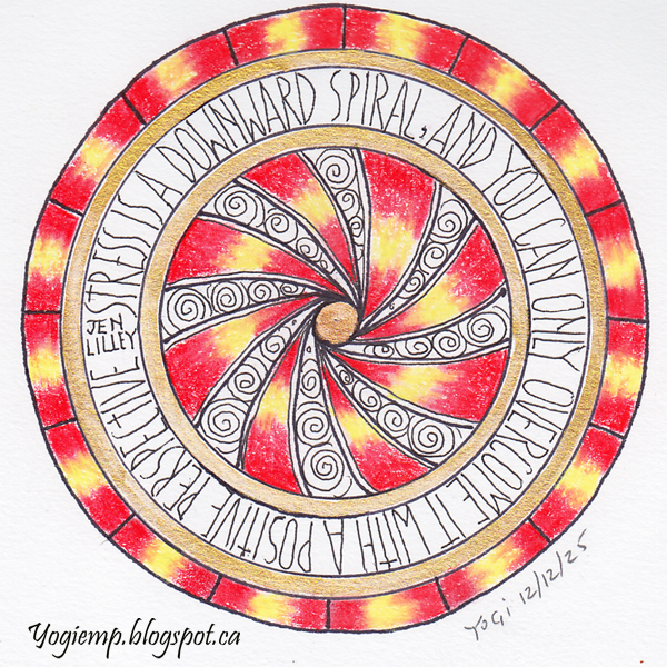 size: 4.5"sq On Canson Mixed Media paper created the circles, adding the design in the center, then the gold border, the lettering, gold border and outside circle using Prisma colored pencils, Juice Up pen for the lettering and Kuretake gold paint. words: Stress is a downward spiral, and you can only overcome it with a positive perspective. Jen Lilley