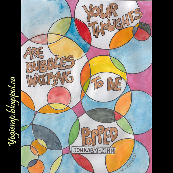 size: 6"h x 4.5"w On Canson Pen & Ink paper drew out the circles, painted with w/c and funky lettering style. words: Your thoughts are bubbles waiting to be popped. Jon Kabat - Zinn