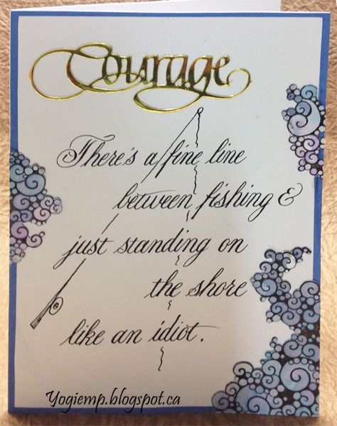 ID: Copperplate - ECD Courage - There's A Fine Line Using Designs By Ryn stamp set "Sea Creatures 2" inked with Versafine Black Onyx and clear embossed then swished through Distress pad inks misted with water on a craft sheet. Courage die cut from DoCraft gold mirror cardstock Words: There's a fine line between fishing and just standing on the shore like an idiot. |