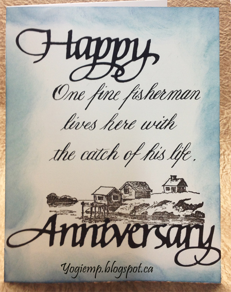 ID: Copperplate - ECD Happy Anniversary - One Fine Fisherman Inked the Old Island rubber stamp with Versafine Black Onyx and clear embossed. Sponged around edges with various blues. Words: One fine fisherman lives here with the catch of his life. |