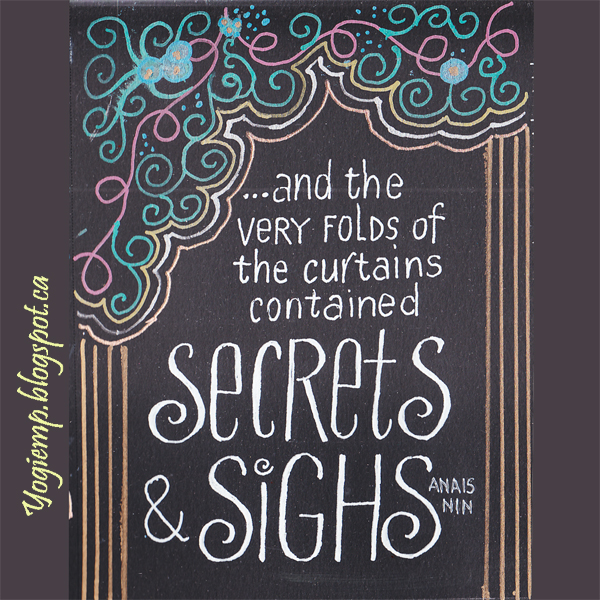 1, 2026 size: 6"h x 4.5"w On Canson Black Drawing Paper using various metallic gel pens doodled the curtain design... added the text with a white Gelly Roll 10 pen. words: ... and the very folds of the curtains contained SECRETS & SIGHS. Anais Nin