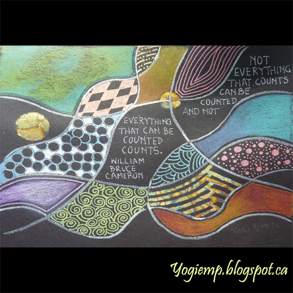2025 size: 4.5"h x 6.25"w I was in a mood to play with black paper again... so opened my Strathmore Black Field Drawing book and started adding wavy lines. Then coloring with Prisma colored pencils, then played with some Uniball metallic gel pens, then decided to put some gold leaf (Mona Lisa Variegated Green Leaf). This time I used a good bottle of Gerry Tresser Gold Size Gilding Adhesive. Text in monoline with a white Juice Up pen. words: