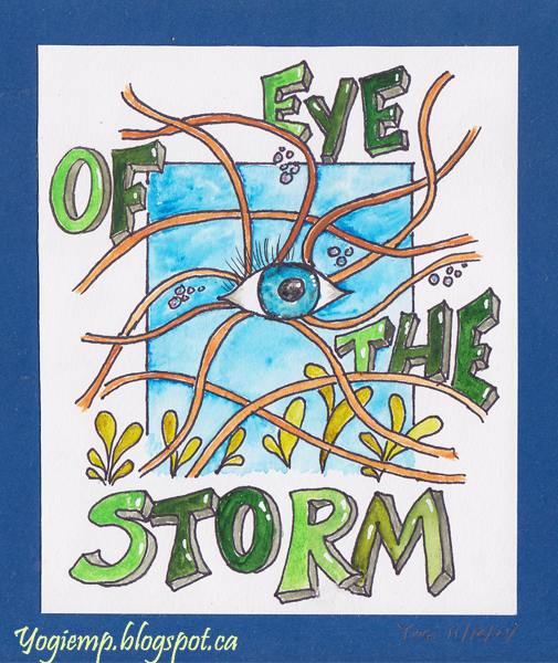 size: 5.5"w x 6.5"h On Canson Mixed Media paper created the design with a Sharpie Fine Tip pen. 3D funky lettering. Painted with various brands of watercolors adding white Gelly Roll highlights and a Juice Up pen for the lashes. words: Eye Of The Storm |