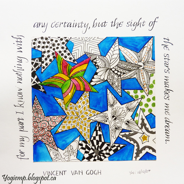 size: 8.5"sq On Canson Mixed Media paper using a star template and fine tip Sharpie pen drew out the stars. Painted the background with Holbien "Peacock Blue". Doodled in the stars, then colored some of them with metallic Gelly Roll pens. (That white spot on my colored star is a dust spot on my scanner...ugh). Added a coating of Glossy Accents on the colored star. Text written with a Zebra nib and Holbien black gouache. words: for my part I know nothing with any certainty, but the sight of the stars makes me dream. Vincent van Gogh |