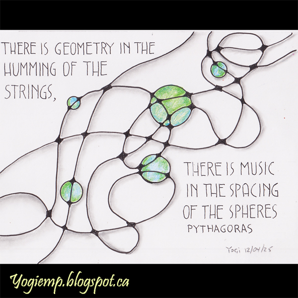 Doodle - Humming Of The Strings Created: April 13, 2025 size: 6" w x 4.5" h I drawing random lines on my paper, then adding the spheres and then found a quote to go with it... Done on Canson Pen & Ink paper using a Zig Writer, Prisma colored pencils, and Juice Up pen for the text. words: There