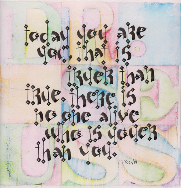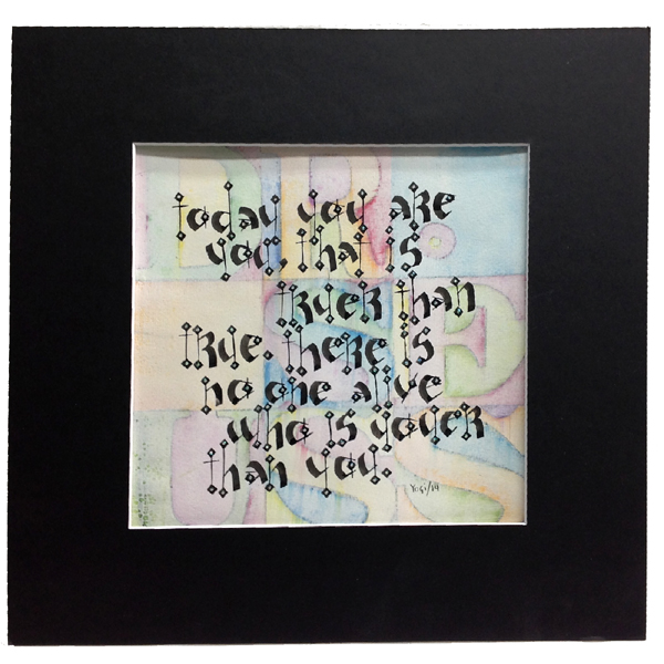 Drew my blocks lightly with a pencil. Drew my letters to spell DR. SEUSS then outlined them with a Warm grey Prisma colored pencil. Colored the letters with Derwent Inktense watercolor pencils and moved the color around with a waterbrush. I found it a bit too intense... so pulled out my Gelli plate and put a layer of cheap thin gesso on it, brayered it smooth and then pressed my artwork down on it, and while still wet, used a paper towel to rub off some of the gesso, which activated some of the color beneath as well. Love the muted and distressed effect this gave. Also love the lettering I used for the text block (originally found on Peter Taylor - Brisbane Aus. website), done with a 3.8mm Parallel Pen filled with Sumi Ink mixed with H2º. When dry added dots of Viva Glitter Liner "Holo Iridescent" in the diamonds. Quote: Today you are you, that is truer than true. There is no one alive who is youer than you. Dr Seuss