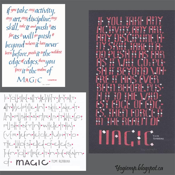 Edmonton Calligraphy Society puts out a challenge to it's members every month. This month is take a quote and do it 3 ways... The top left image started out as my homework for Barbara Close's Italic class. Then I saw something a friend did and had to do something similar... and then I was in a mood to do something on black. I noticed there's a slight error in one of the pieces... c'est la vie. Quote: If you take any activity , any art, any discipline, any skill, take it and push it as far as it will go; push it beyond where it has ever been before, push it to the wildest edge of edges, then you force it to the realm of MAGIC. Tom Robbins |