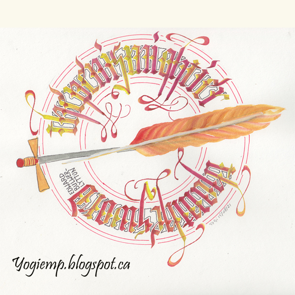 Created: August 15, 2021 This month's Edmonton Calligraphy Society's challenge is Pen, Ink, Paper. On Be Super Deluxe paper, 3.8 Parallel pen filled with Holbien Red Flame gouache and double dipped into FW Pearlesent "Genesis Green" ink wrote out the text in Blackletter style. Detailing with a black micron pen and a red Zig Writer. Painted the sword and feather with QoR watercolors. Quote: The pen is mightier than the sword. Edward Bulwer-Lytton Formula: Write out your text with the nib and in the lettering style you'll use. Measure it and do a radius calculation. (C=2πR) or R=C÷2π If the length (circumference) of my work is 15", (π= 3.14) so 2π = 6.28. Divide 6.28 into your circumference of 15" and you get basically a radius of 2.4".