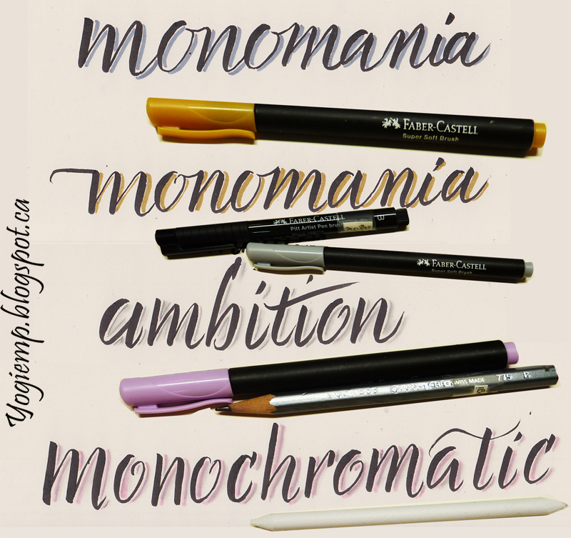6, 2025 size: ECS hosted Sally Penley to teach us Brush Lettering. Fun Evening. I worked on my Genoa Bond paper using various tools as pictured. Mainly with a Faber Castell Pitt Brush Pen "B" along with Black Edition Felt Tip soft brush pens in various colors and a B Caran d'Ache B pencil and paper stump. words: monomania