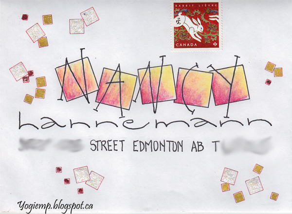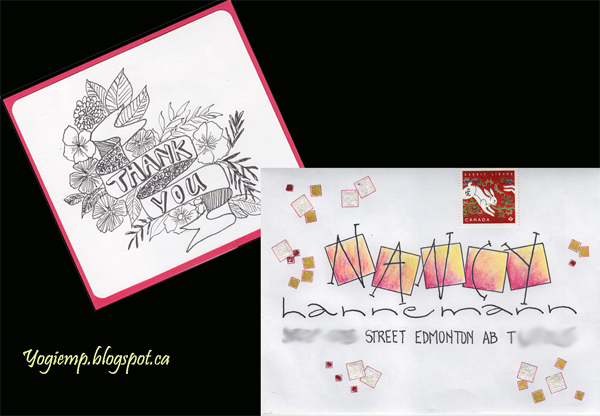 2023 A friend has gone above and beyond keeping me in the know and I thought I'd send her a thank you note. For more info about the card see below Nancy's name on the envelope is a style of lettering I haven't done in a very long time... I used to love making these box letters... I drew squares and the lettering using a black Uniball pen, Prisma colored pencils (yellow & red) and Lyra Splendor Blender. Then added various size small squares some filled with Stickles Dry Glitter "Star Dust" and Ritz Glitter "Regal Red" and some filled with a Uniball gold gel pen. |