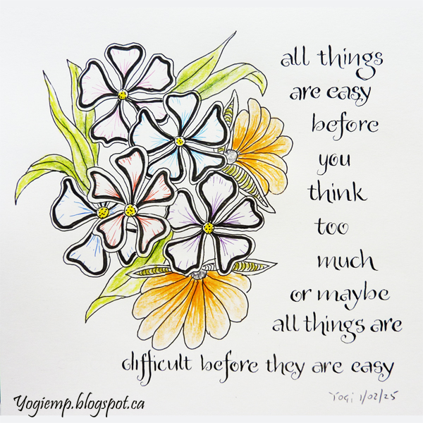 1, 2025 size:7"sq Just doodling away again in my Canson Pen & Ink paper booklet. Drew the flowers using various colors of Juice Up pens and a Zig Writer as well as Prisma colored pencils. Text written with a Zebra G nib and Sumi ink in a funky lettering style. I started writing the text and put the word "easy" before the word "difficult"... so I continued with my save... words: |
