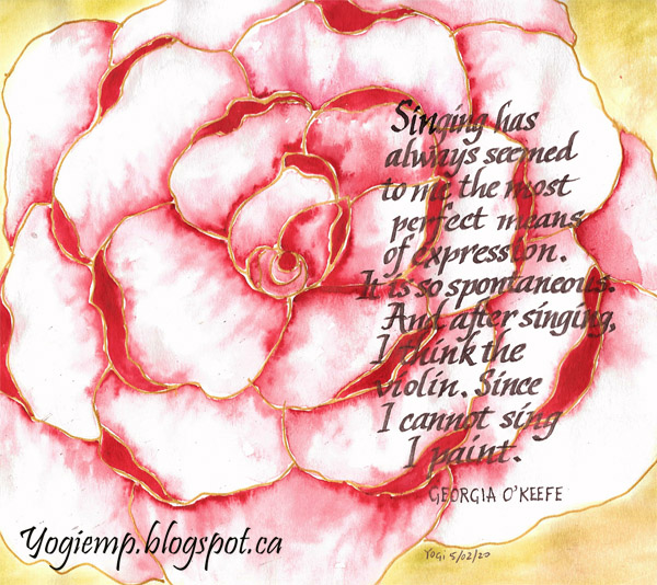9" w X 8" H Our Guild (BVCG.ca) has a theme of pick an artist, create some artwork in his/her style and then do something calligraphic with that style... I love a lot of Georgia's paintings especially her large abstract florals. I created my own over sized floral painting - not sure if it's more a rose or a peony. I'm pretty ignorant when it comes to the details of flowers. Outlined with a gold gel pen and painted with Daniel Smith watercolors. Sponged some Pan Pastel light green around the edges. Did some Italic using a 1.5 Parallel pen and Sumi ink. I can't sing either so I do my arty stuff and paint. I can identify with the quote... Quote: Singing has always seemed to me the most perfect means of expression. It is so spontaneous. And after singing I think the violin. Since I cannot sing, I paint. Georgia O'Keefe |