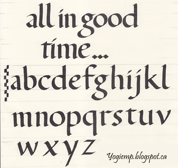 2022 I was looking in Jan Pickett's Decorated Lettering book and this time was in a mood to play with serious lettering - Foundational. I definitely prefer it to Italic... On Genoa bond calligraphy paper using a 4.5 parallel pen and Sumi ink. |