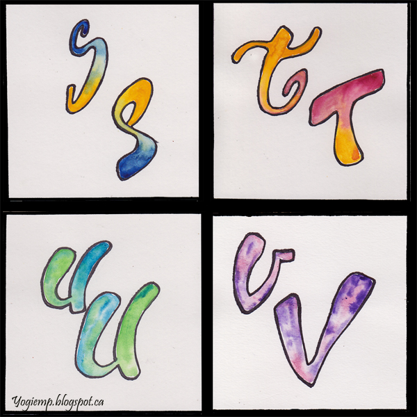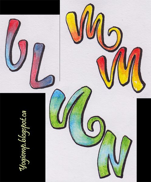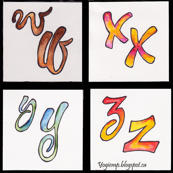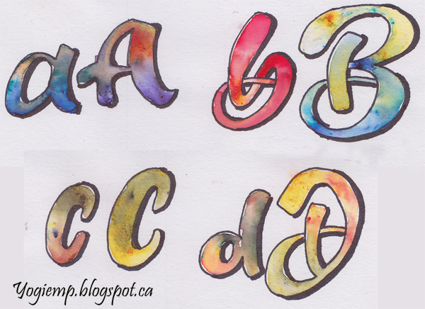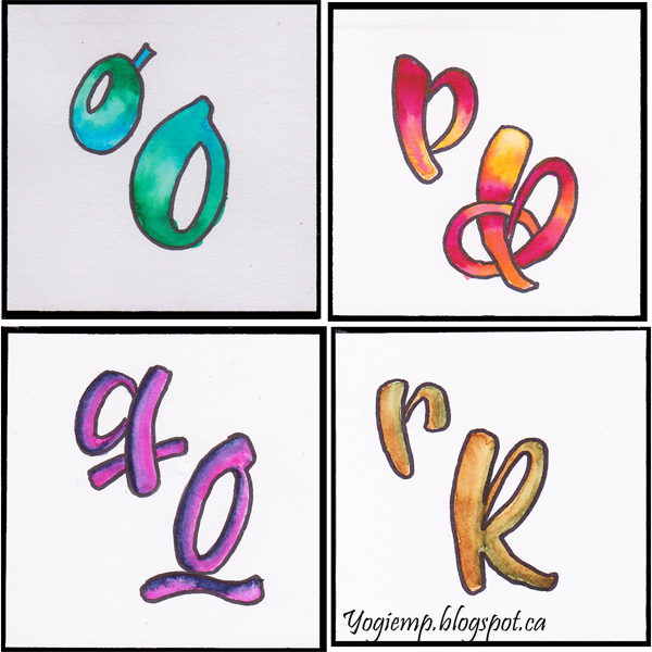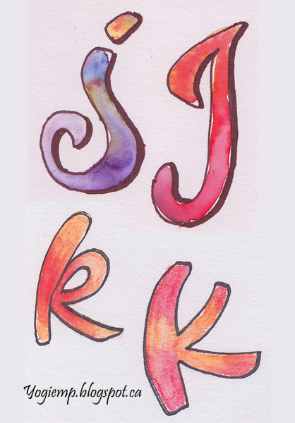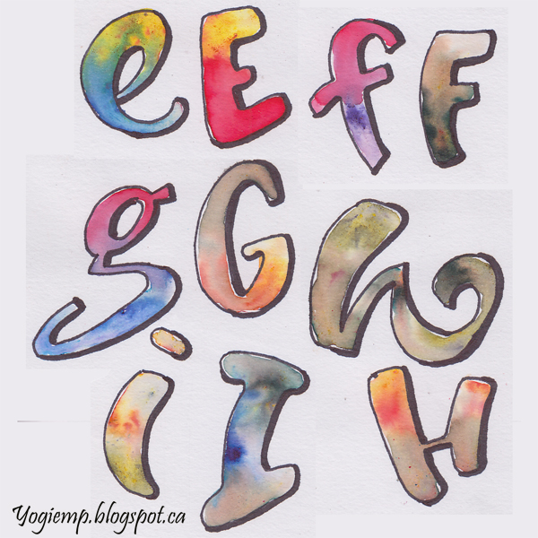 2023 I'm a follower of das.frollein.tina on Instagram and really like her take on an alphabet, so have been playing with it as well, more copying really. She's basically using w/c markers. Booklet bound. I used a very heavy misc white cardstock and adhered all my letters to both sides of the pages. I bound it using a Slip Knot technique with 4ply turquoise waxed linen thread. I drew and cut out the letters for the word "Funky" from a geli print I made, adhered to the cover and outlined with a Sharpie pen. Created a ribbon underneath the title for the word "LETTERS" For the 1st batch between "A and J" I used Brusho powders dropped into a water logged letter. On on Fabriano 1264 Mixed Media paper. I used a Sharpie pen for the shadow