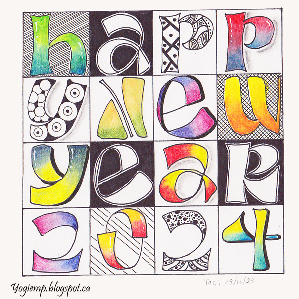 2023 size: 6" sq I came across this funky lettering lettering style in blocks on Pinterest...I expanded on the design by decorating either the letter or block of each letter and mimicking the style to create the numbers. Each block is 1.5" sq. on Canson Mixed Media paper. Juice Up pen, Derwent Inktense w/c pencils, graphite, sharpie pen.