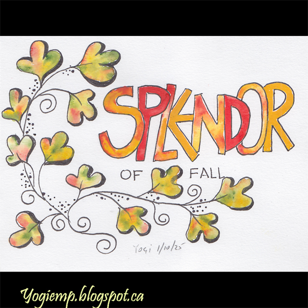 size: 6" w x 4.25" h On Canson Mixed Media paper, created and painted my leaves and words with various brands of w/c. Outlined/shadowed with a Zig Writer. words: Splendor of Fall