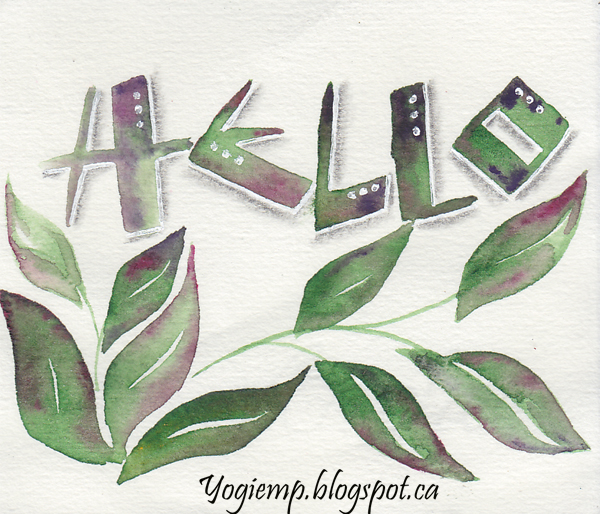 Winsor & Newton Sap Green, touched with Grumbacher Thalo Purple & W/N Opera. Graphite shading and paper stump. Uniball Signo white gel pen between letter and graphite and for dots. |