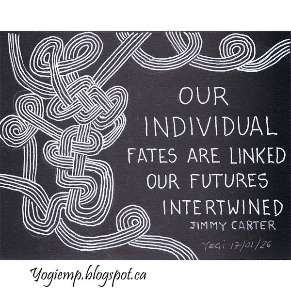Future Intertwined Created: January 18, 2026 size: 6"w x 4.5"h On Canson Black Drawing paper created the wavy doodle using a white gel pen... Text written with a pointed nib and Bleed Proof white ink. words: Our individual fates are linked our futures intertwined. Jimmy Carter |