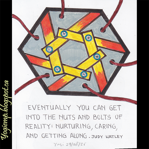 size: 4.5"w x 5"h On Canson Pen & Ink Paper drew out the hexagon design and colored with w/c and metallic glitter paint. Monoline text, words: Eventually you can get into the nuts and bolts of reality: nurturing, caring, and getting along. Judy Wately