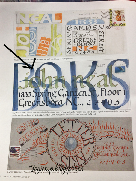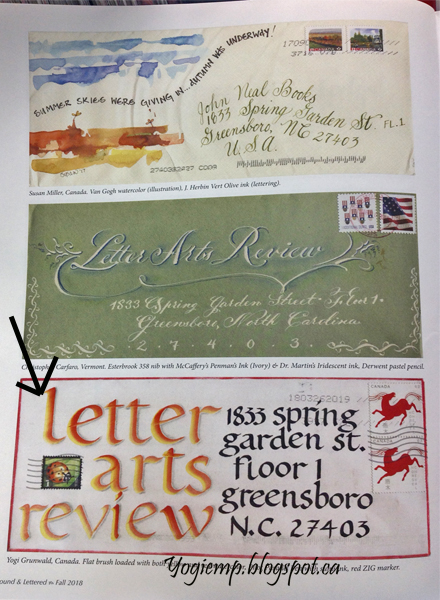 This was an envelope I created to mail my renewal check... which they published in the Sept/18 issue #15-4, Stamped pencils, lettering with a parallel pen, Sumi ink in one of my funky styles. |