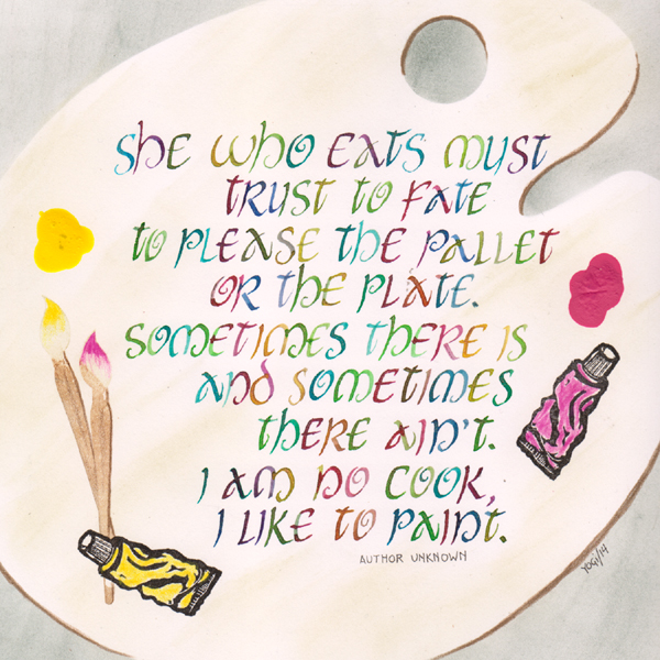 Created the text block using a 1.5mm Parallel Pen with Dr Martin's Tech Drawing Ink (Rhodamine, Turquoise, April Green & Daffodil) and Sparkle Bronze powder (Neuberg Ebel) sprinkled on top. This time I used an Uncial style lettering. When dry I created a stencil of a pallet and sponged Distress "Iced Spruce" around the outside edges. Then sponged "Old Paper" in a streaky fashion on the pallet. Did some shadow marks using a brown Prisma colored pencil. Stamped the paint tubes (gg designs "Funky Art Tools" set) using Versafine Bklack Onyx. then colored in with the Prisma colored pencils. Added the paint brushes (Stamp-It set #004) using Distress pads, "Old Paper" for the tip on the brush and "Vintage Photo" with touches of "Walnut Stain" for the handles, then added the colored pencil detail. As a final touch just poured on some acrylic paint blobs in a bright yellow and a fuchsia. Words: She who eats must trust to fate to please the pallet or the plate. Sometimes there is and sometimes there ain't, I am no cook, I like to paint. author unknown