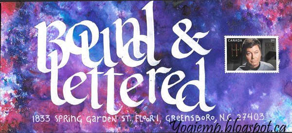 I used Brusho's and Colour Burst powders to create the background. Lettering done with a flat edged brush and Copic White Opaque ink mixed with H2º. Love the Star Wars postage stamps Canada came out with... All the envelopes were given a coating of Dorland's Wax Medium to protect them in the mail. |