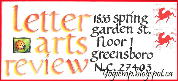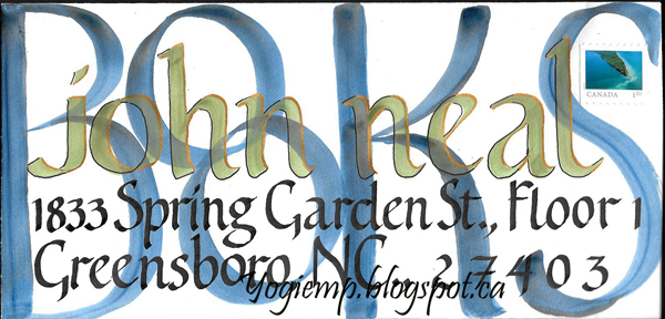 Env John Neal I used a flat edged brush, loading with two tones of blue Winsor & Newton watercolors for the word "BOOKS" in an Uncial style. The John Neal was done with a flat brush and Ecoline Gold. When dry shadow outlined with a black marker and a copper gel pen. The address section was done with a parallel pen and Sumi ink in a Foundational style. |
