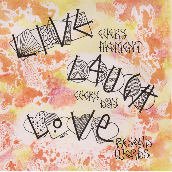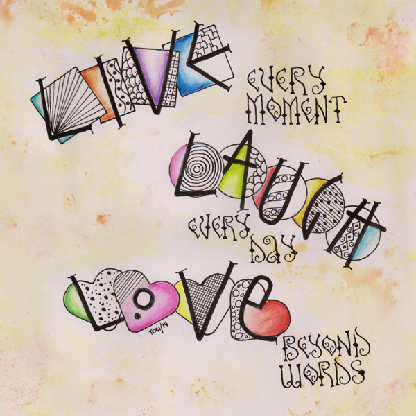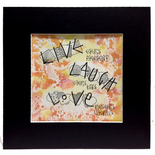 Laugh, Love #3 So I used all the same elements as above, except the background was a 2nd generation print from the Gelli Plate and then I overlay another pull with just brayed yellow. The coloring done with Prisma colored pencils and burnished with a Lyra Splendor Blender. Words: Live every moment, Laugh every day, Love beyond words