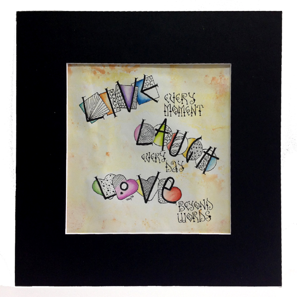 Brayered Memento dye inks onto my Gelli plate (yellow, green, orange, fuchsia), misted with water, mushed around with my finger to blend a bit, and picked up the ink in the area of my main words to keep them as white as possible, then placed my watercolor paper down and burnished. Drew in my boxes (squares, circles & hearts), then wrote in my main words with the bullet tip of a Zig black marker. Added the doodling with the fine tip and some with a Micron pen. Wrote in the descriptive words with a Nikko G pointed nib and Sumi ink mixed with some H2º in my "Fickle" font. Words: Live every moment, Laugh every day, Love beyond words