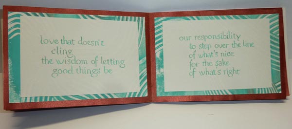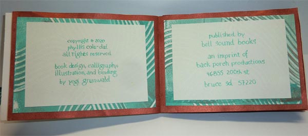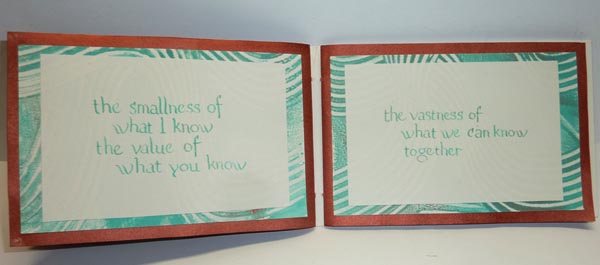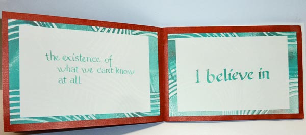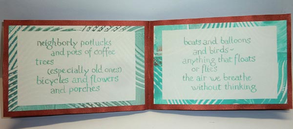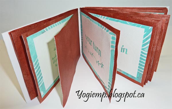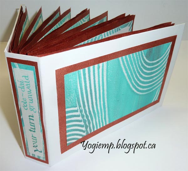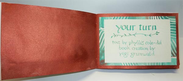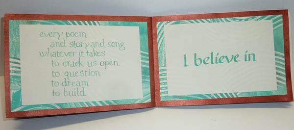 TITLE: Mini Book - YT11 - Turquoise Arches Text Wove for the hand written text written with a pointed pen or a 2.4 Parallel pen in a Foundational style lettering using Holbien "Turquoise" and Neuberg Ebel Copper metallic powder. These pages adhered to a decorative layered Geli print on Text Wove using Delta Ceramcoat "Turquoise" and FolkArt "Copper". A texturing tool used for the design. This was then adhered to the Canson Ingres white painted with the copper. The book cover and box made from Stonehenge white heavy weight paper and embellished with the Ingres and decorative papers. The book is 6"w x 4"h x 1"thk
