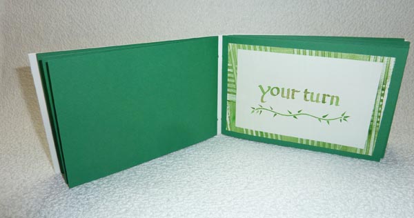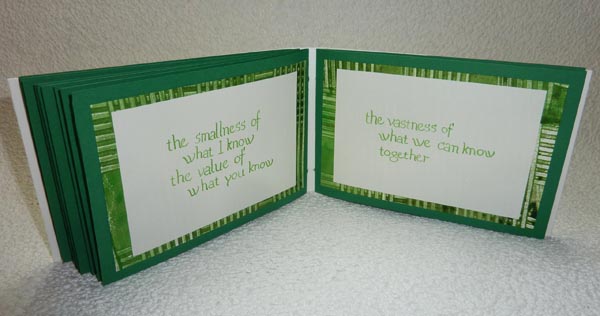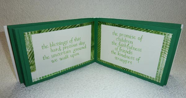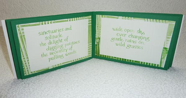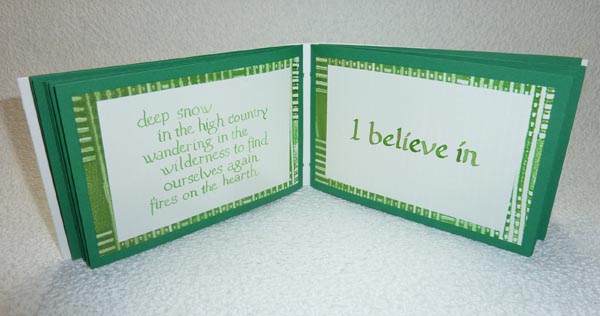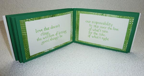 TITLE: Mini Book - YT12 - Irr Green Arches Text Wove for the hand written text written with a pointed pen or a 2.4 Parallel pen in a Foundational style lettering using Dr. Martins "Irridescent Green" Calligraphy ink. These pages adhered to a decorative layered Geli print on Text Wove using Liquitex "Lt Green", "Hooker's Geren Permenant Hue", and Folk Art "Antique Gold". A texturing tool used for the design. This was then adhered to the Canson MiTientes "Bright Green" medium weight cardstock. The book cover and box made from Stonehenge white heavy weight paper and embellished with the MiTientes and decorative papers. The book is 6"w x 4"h x 1"thk