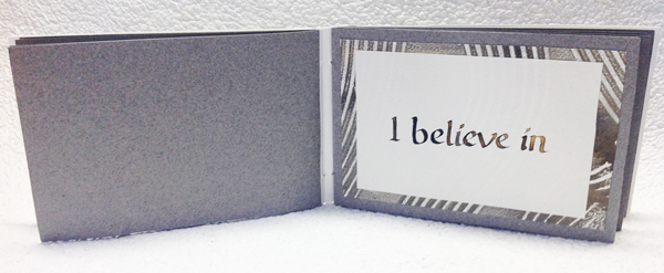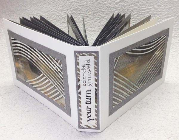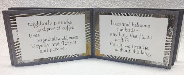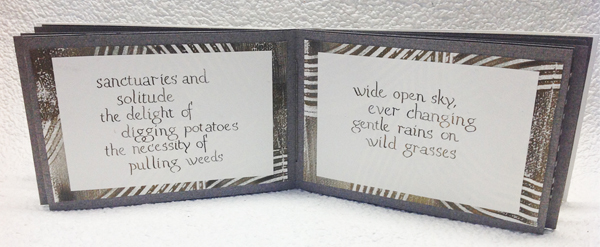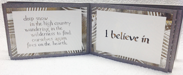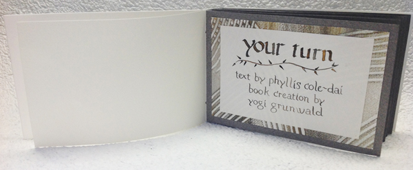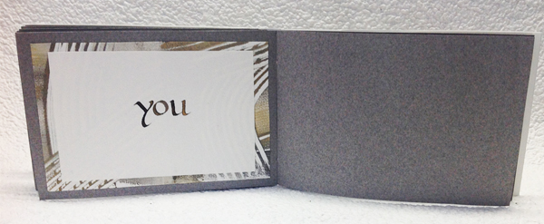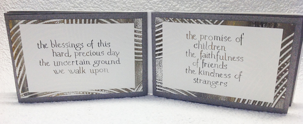 TITLE: Mini Book - YT4 - Black/Gold Arches Text Wove for the hand written text written with a pointed pen or a 2.4 Parallel pen in a Foundational style lettering using a double loading technique - 1st into Black Sumi ink and then into Holbien gouache " Rich Gold". These pages adhered to a decorative layered Geli print on Text Wove using Golden's Fluid Acrylic (Iridescent Bright Gold) and Plaid Folk Art "Metallic Sequin Black". A texturing tool used to add the swirly design. This was then adhered to the Canson Ingres (Steel Gray) pages. The book cover and box made from Stonehenge white heavy weight paper and embellished with the Ingres and decorative papers. The book is 6"w x 4"h x 1"thk